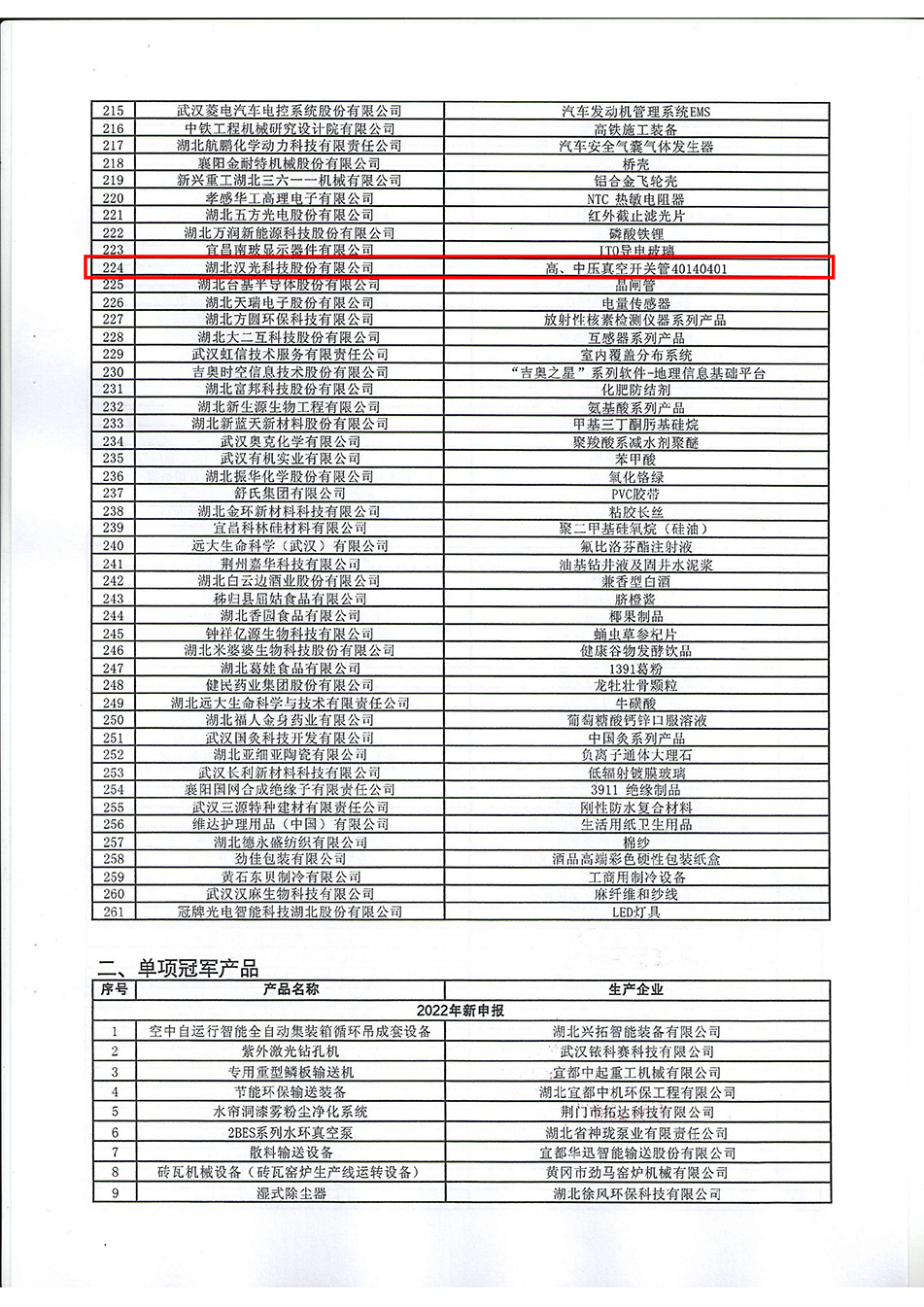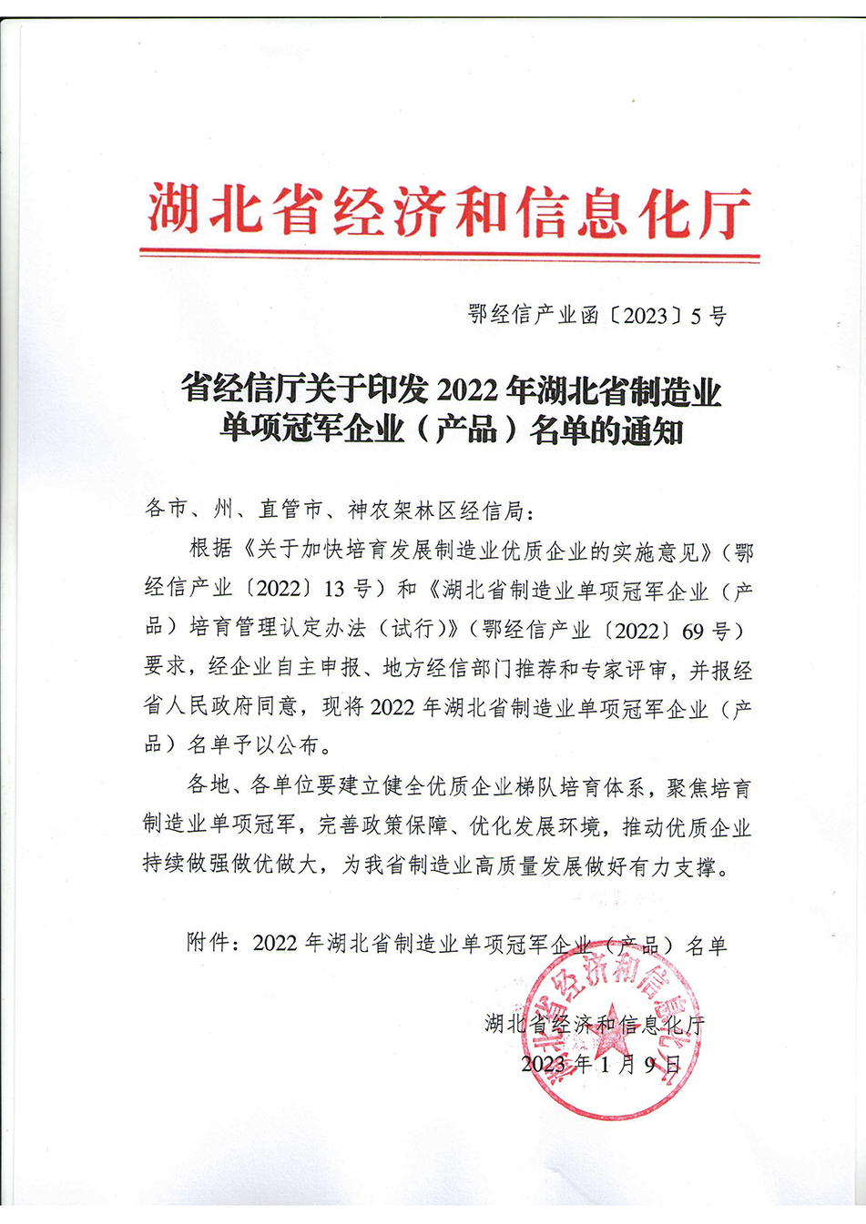 1月9日,湖北省經(jīng)濟(jì)和信息化廳印發(fā)《2022年湖北省制造業(yè)單項(xiàng)冠軍企業(yè)(產(chǎn)品)名單的通知》,公司成功通過省制造業(yè)單項(xiàng)冠軍企業(yè)復(fù)審。