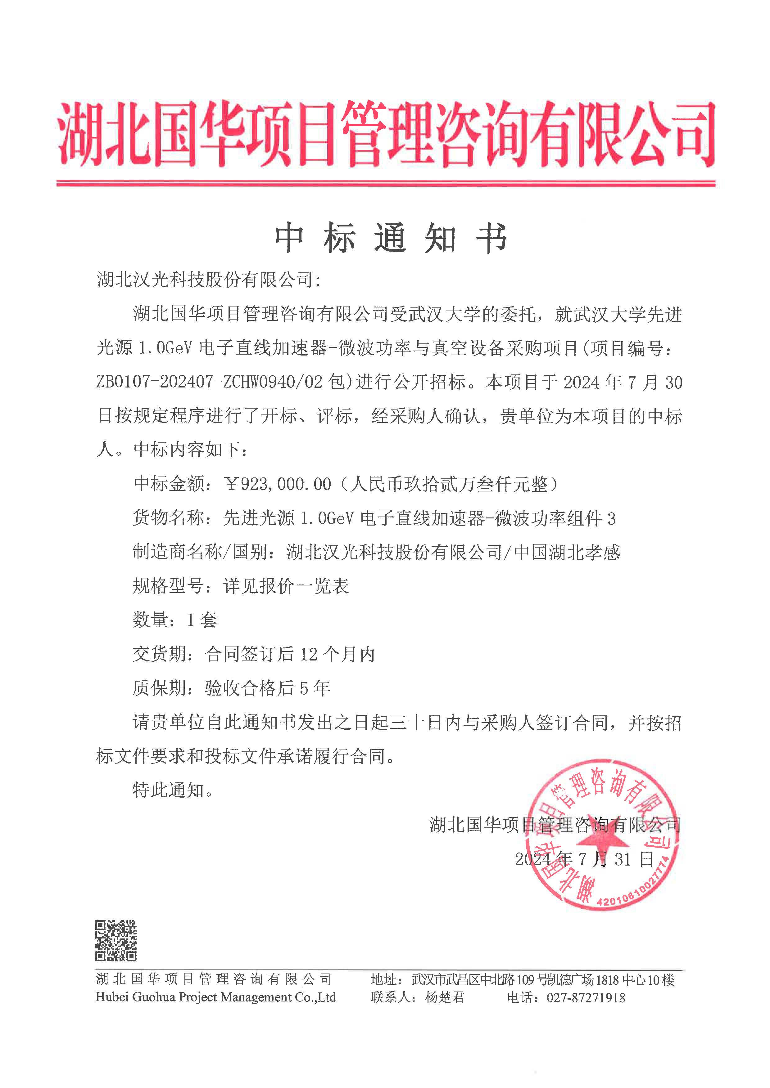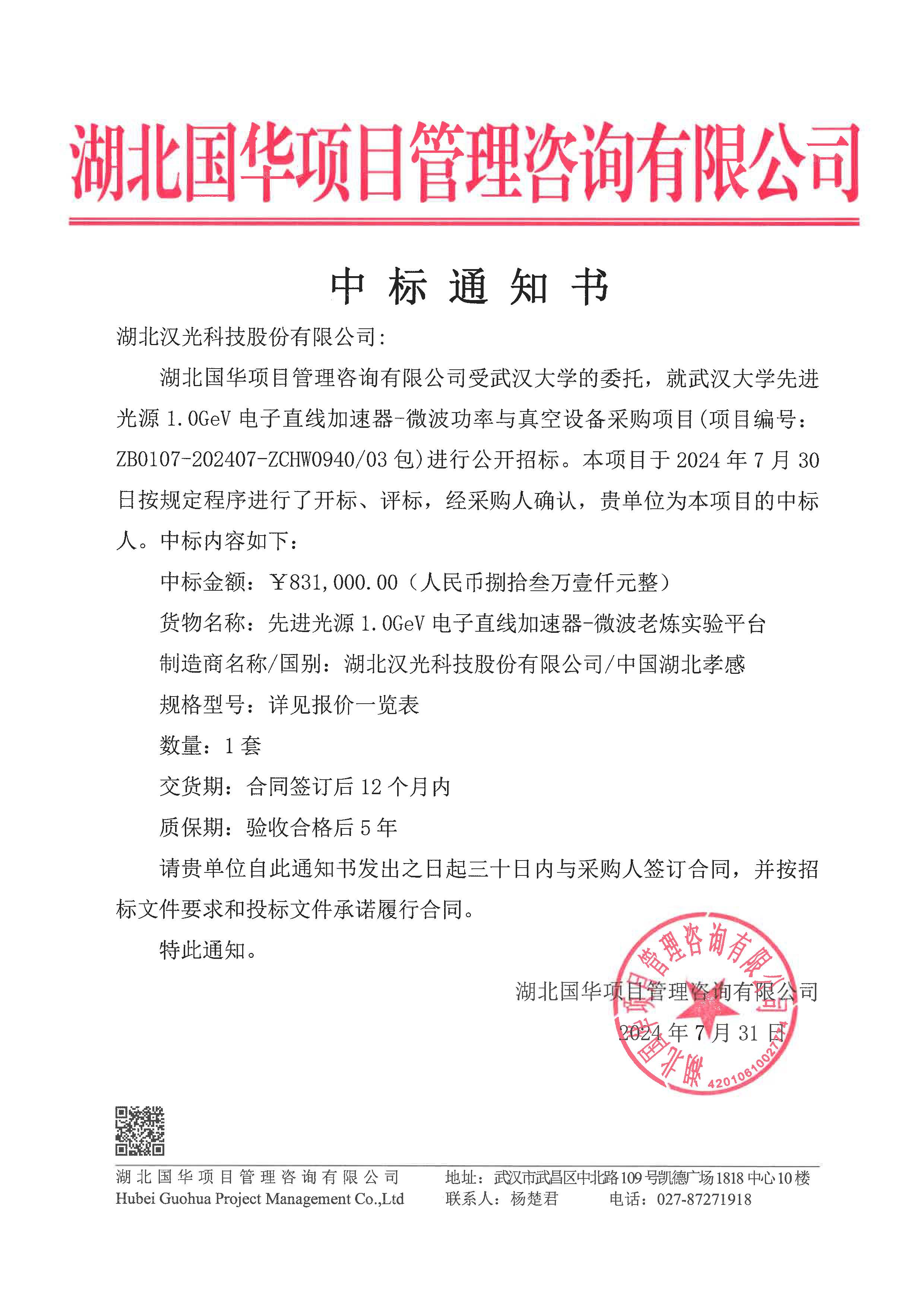 7月31日,公司收到湖北國華項目管理有限公司的中標通知,公司自主研制的微波老煉實驗平臺、波導功率組件成功中標武漢大學先進光源1.0GeV電子直線加速器。中標價格175萬余元。